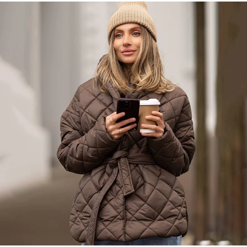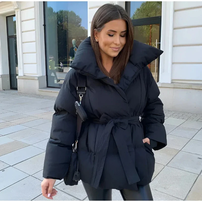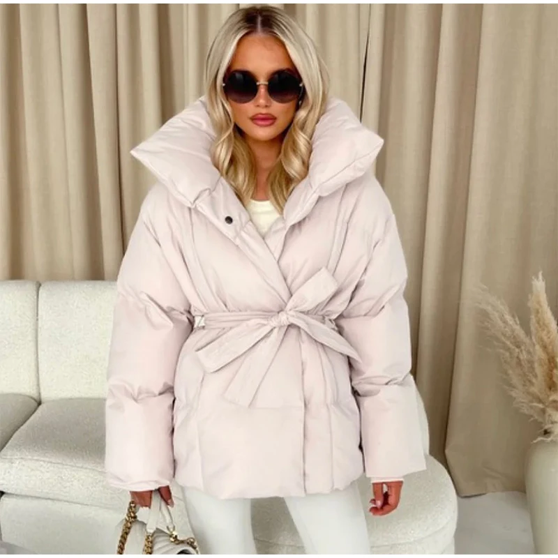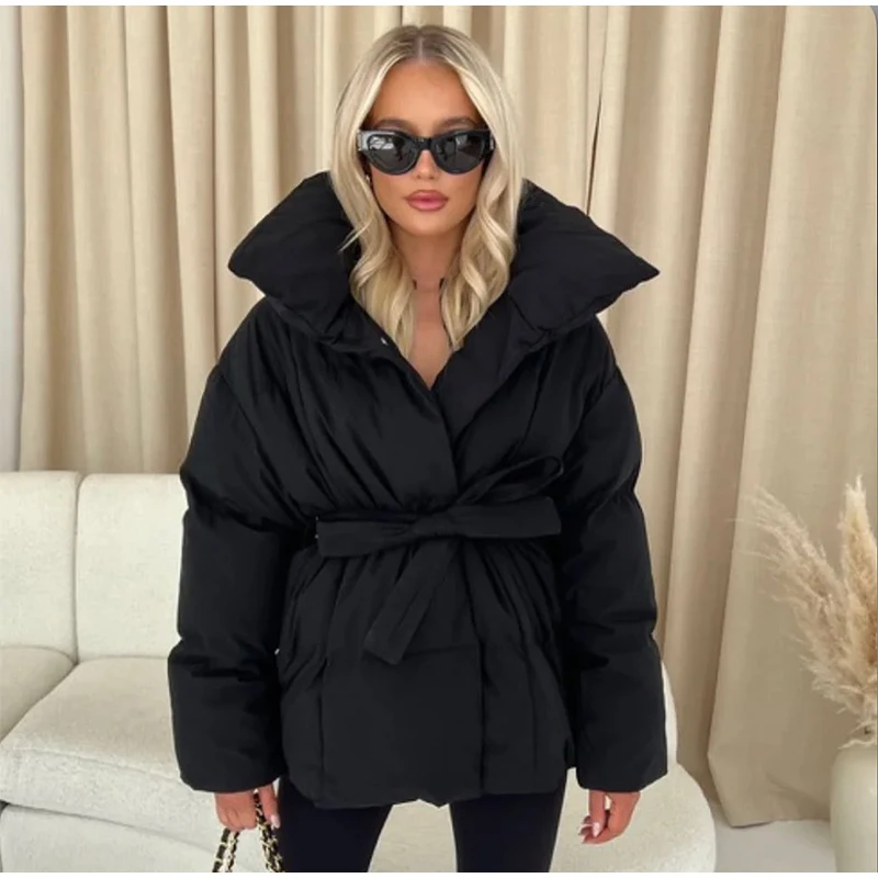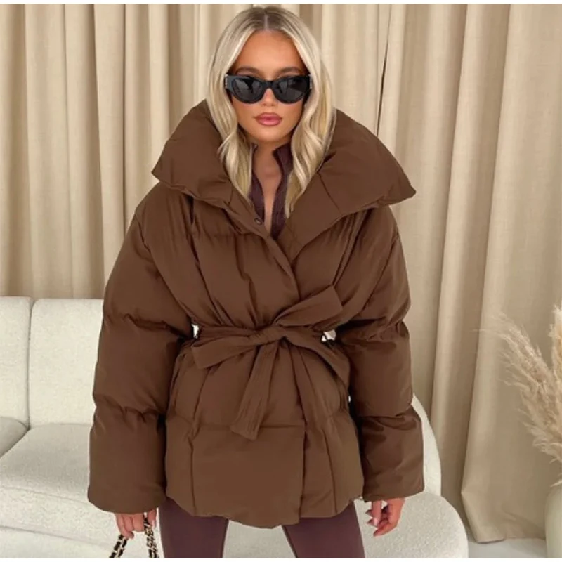 Solid Lapel Lace Up Cotton Coat Women Fashion Long Sleeve Warm Loose Pocket Short Coats Lady New Winter Commute Street Outwears