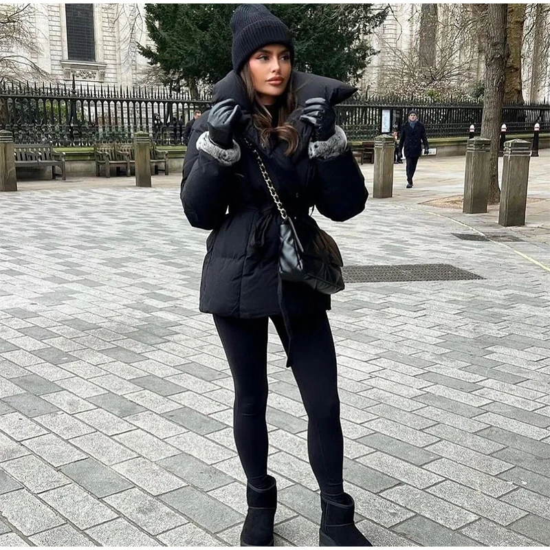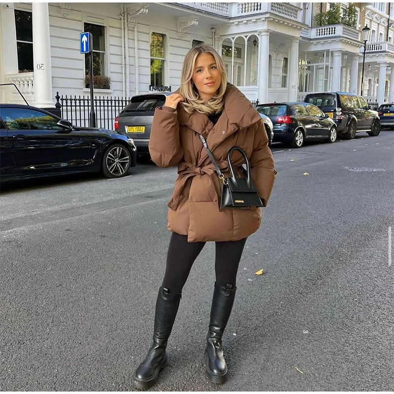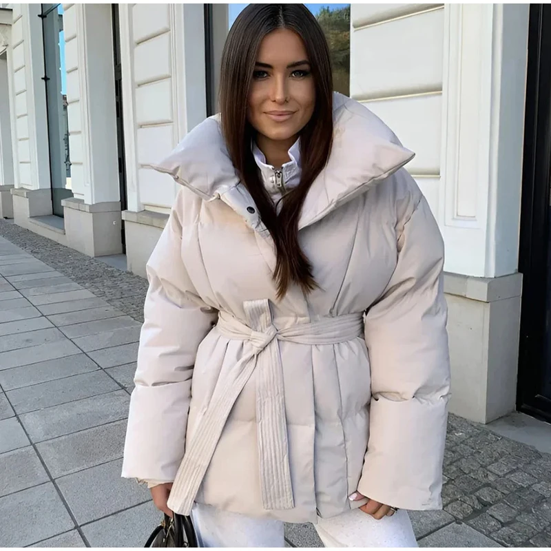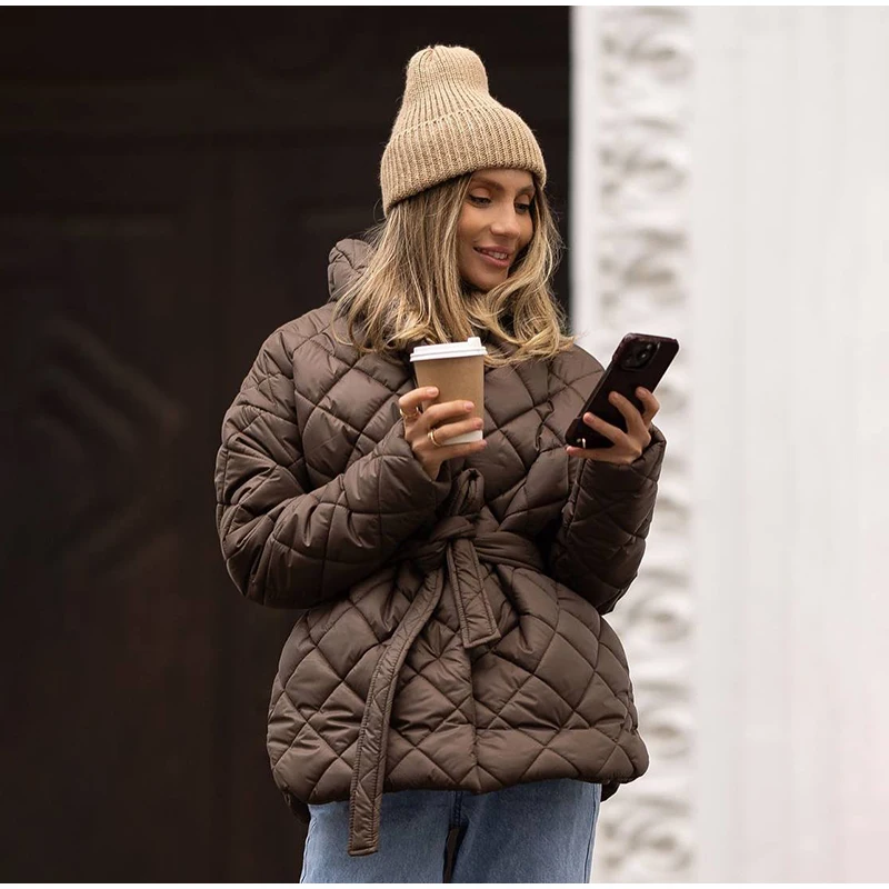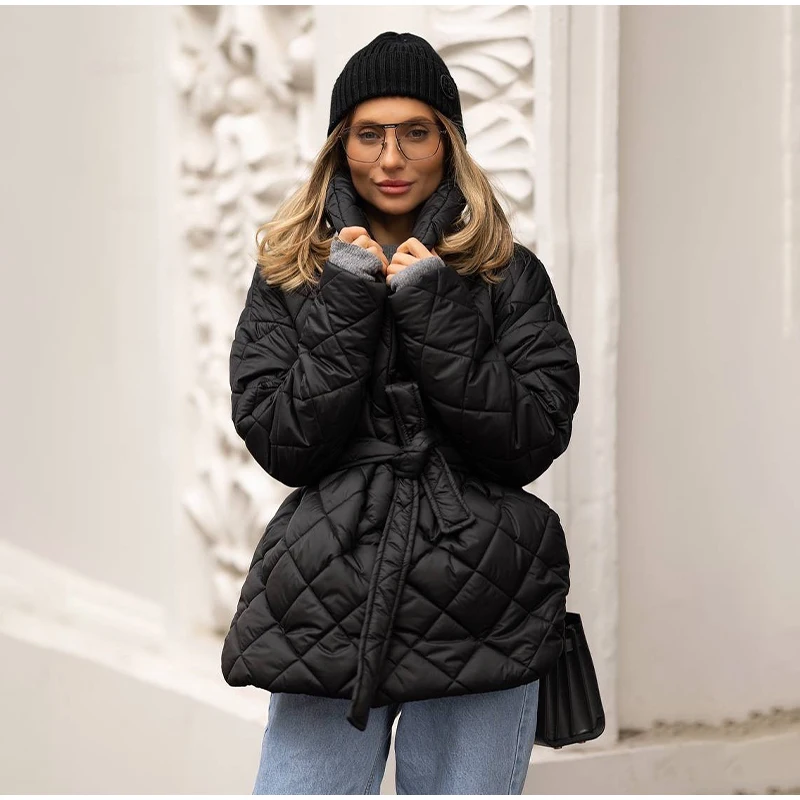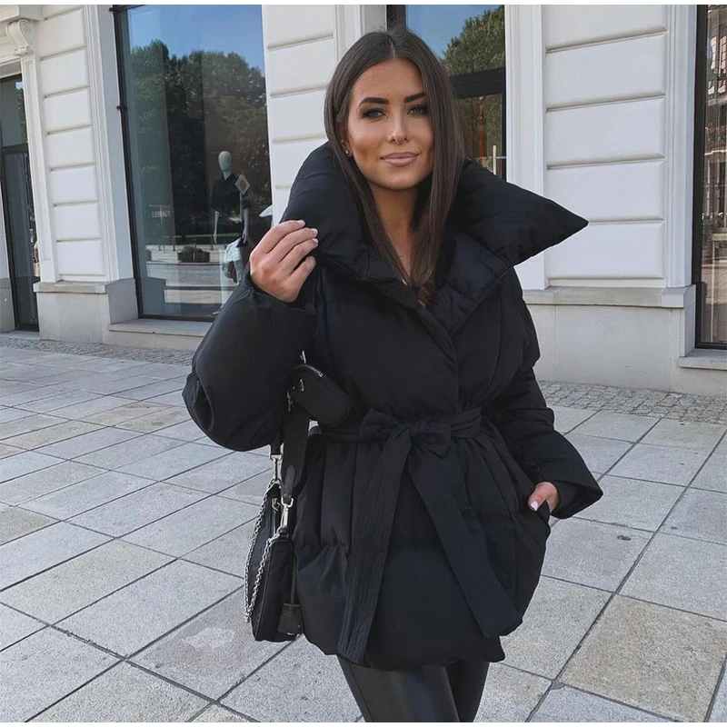 Solid Lapel Lace Up Cotton Coat Women Fashion Long Sleeve Warm Loose Pocket Short Coats Lady New Winter Commute Street Outwears