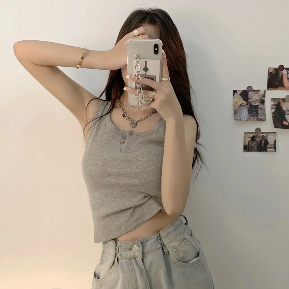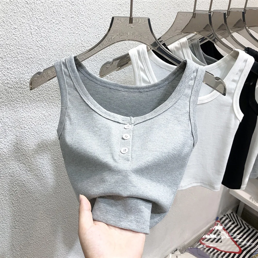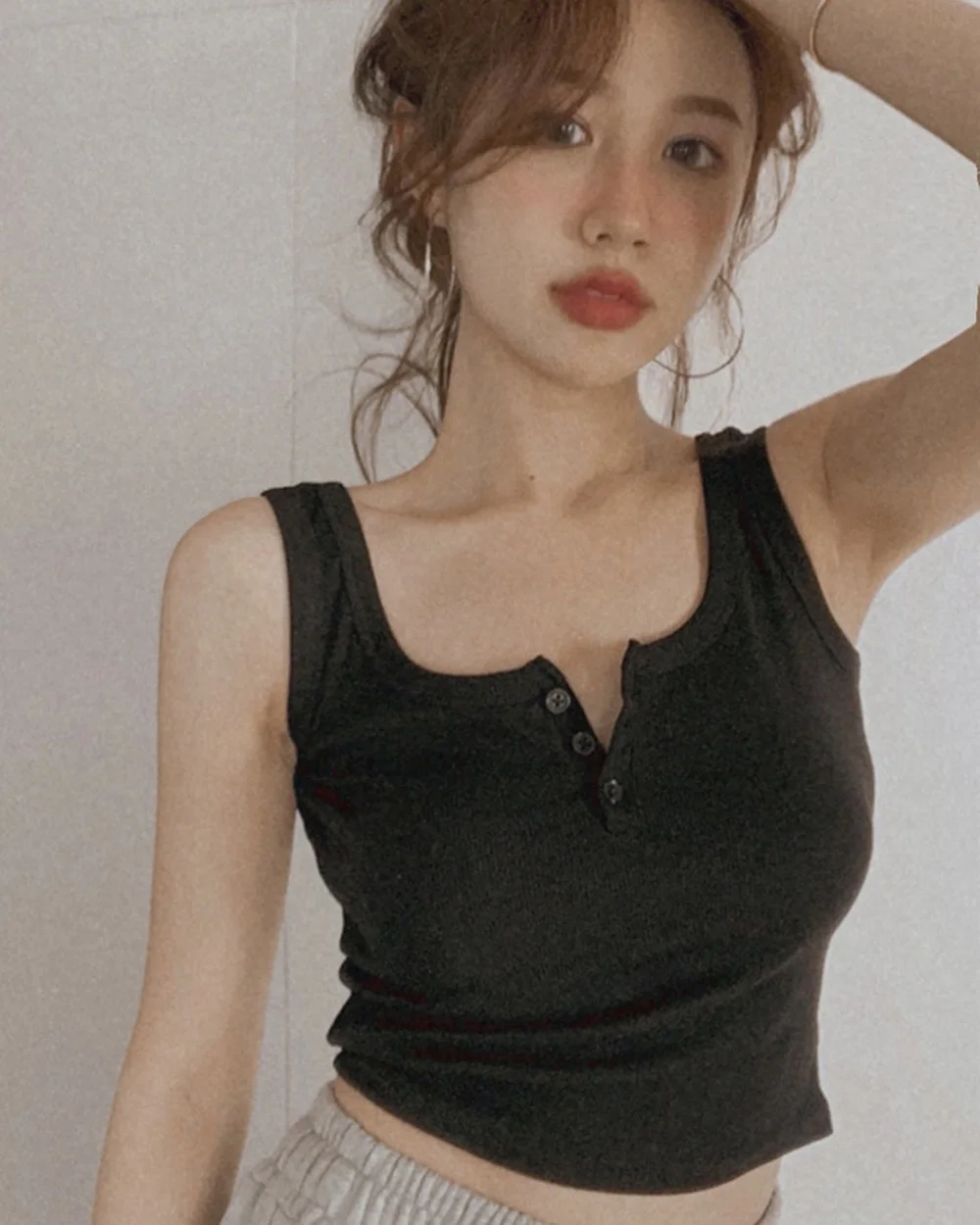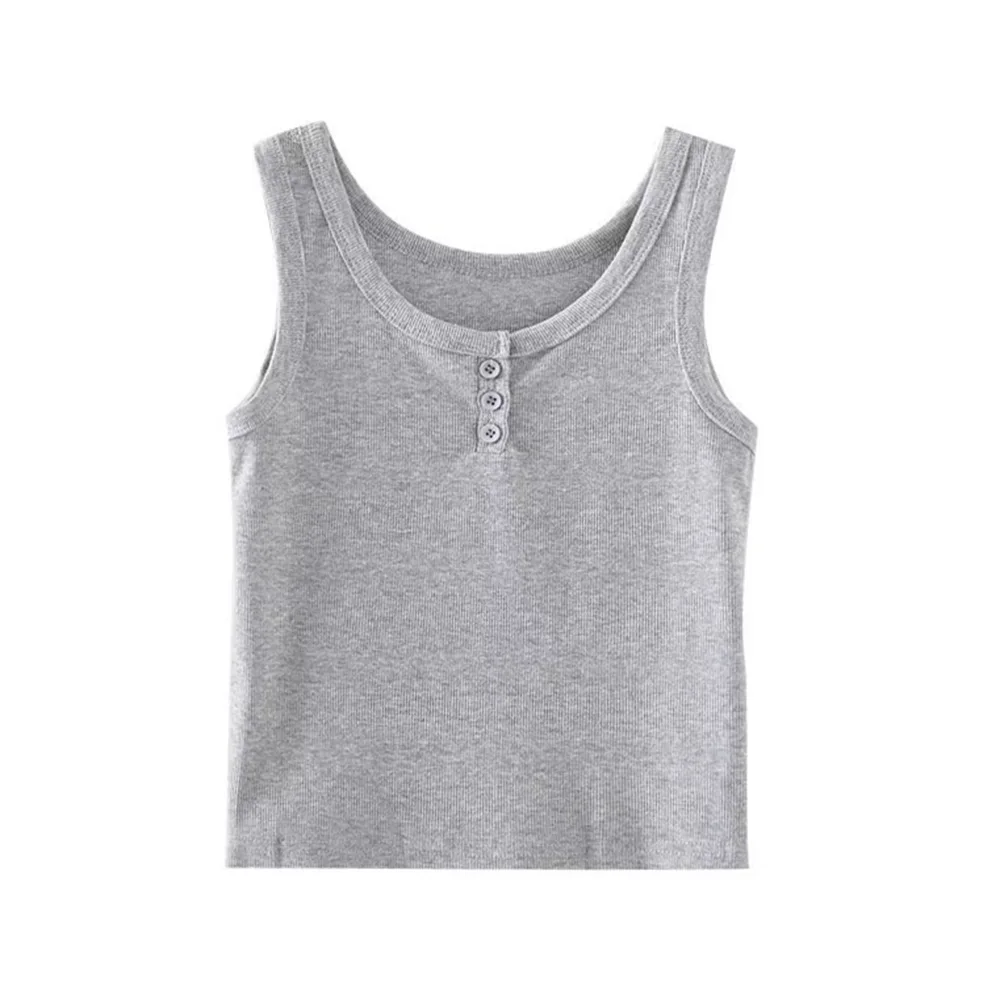 The ribbed texture of the fabric gives it a modern and stylish look, while the round neckline adds a touch of sophistication. To add a subtle touch of decoration, this tank top comes with a set of beautiful decorative buttons that add a hint of detail to the overall design.
